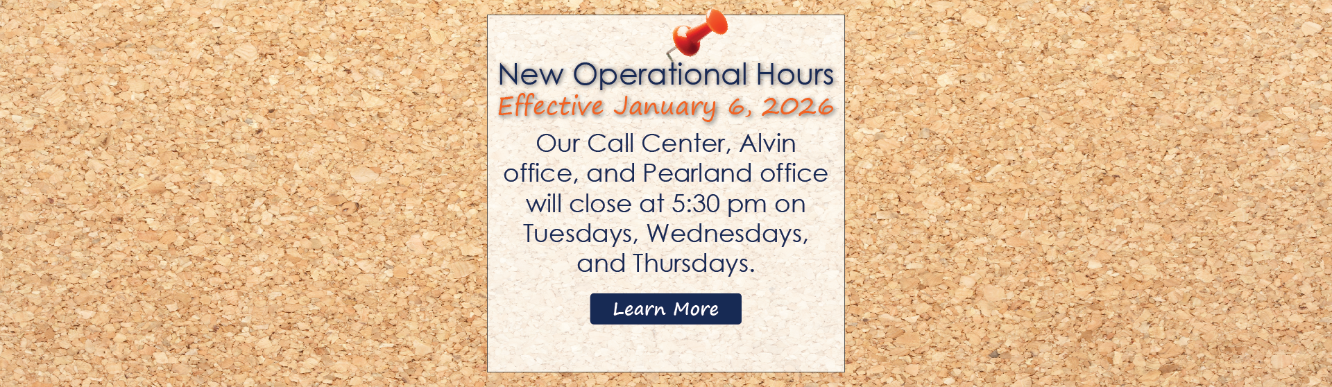Effective January 6, 2026, our Call Center, Alvin Office, and Pearland Office will close at 5:30 p.m. every Tuesday, Wednesday, and Thursday. The opening hours, the High Schools' hours, and the hours on Mondays and Fridays will remain unchanged. You can view our full list of hours on this homepage down below.