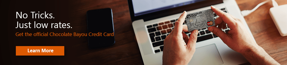 © 2025 Chocolate Bayou Community FCU. All rights reserved. Your deposits are federally insured to at least $250,000 and backed by the full faith and credit of the National Credit Union Administration, a U.S. Government agency. We do business in accordance with the Federal Fair Housing Law and the Equal Credit Opportunity Act. In compliance with the U.S.A. Patriot Act, we are required to obtain and verify identification provided for all new account owners and joint owners, using methods permitted by law.