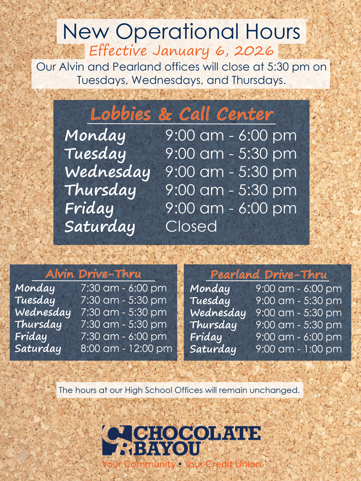 Effective January 6th, our Call Center, Alvin office, and Pearland office will close at 5:30 pm on Tuesdays, Wednesdays, and Thursdays. We will maintain the same hours on Mondays and Fridays — open until 6:00 pm. Our opening hours and the High School Offices’ hours will remain unchanged.